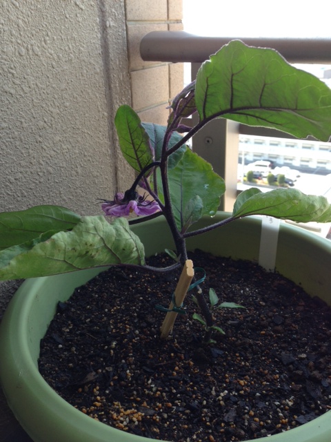 花の様子です。ナスの紫色の花はいつみてもいいですね。